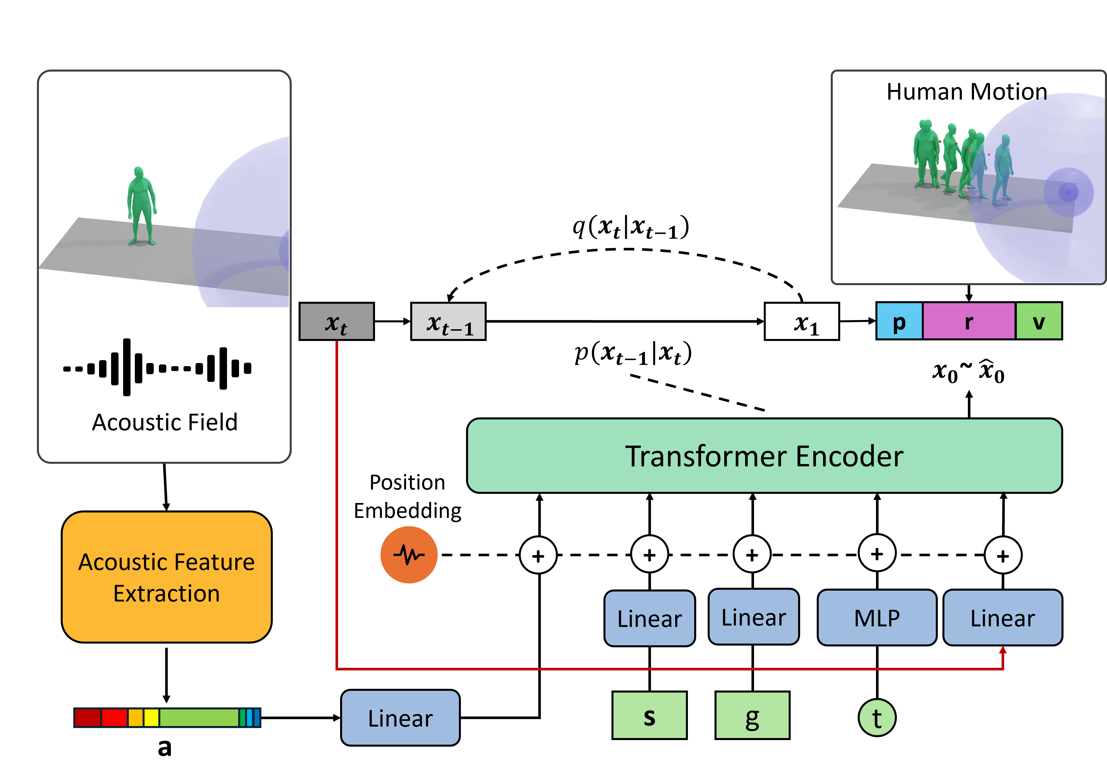 The AMoGen model is a diffusion-based model that can synthesize realistic human motions given spatial audio. The model takes the audio feature vector a, the sound source location s, the motion genre g, the diffusion timestep t, and the noisy motion vector xt as inputs and predict the clean motion sequence x0.